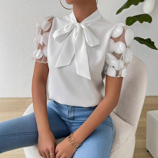 Letnia, jednokolorowa, prosta, koronkowa, kokardkowa koszula z krótkim rękawem