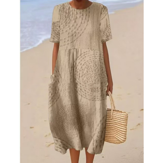 Women's Casual Solid Color Round Neck Mid Sleeve Floral Print Cotton and Linen Dress