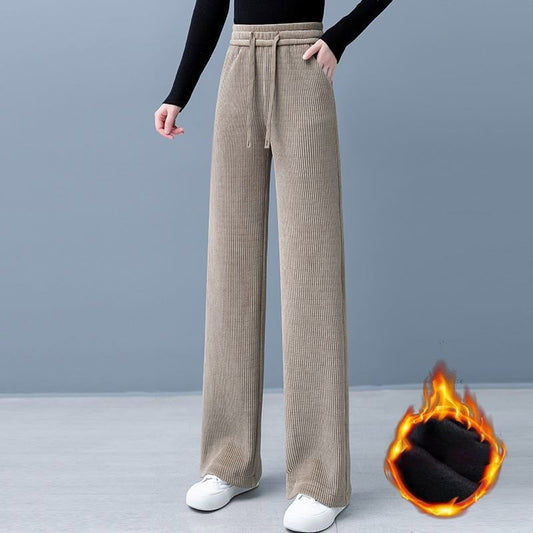 🔥✨Wyprzedaż świąteczna🎅🎁 Damskie spodnie z szeroką nogawką i sznurkiem z podszewką i wzmocnionym jednolitym kolorem.