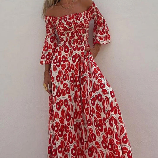 Długa sukienka w kwiaty z odkrytymi ramionami i rozszerzanymi rękawami