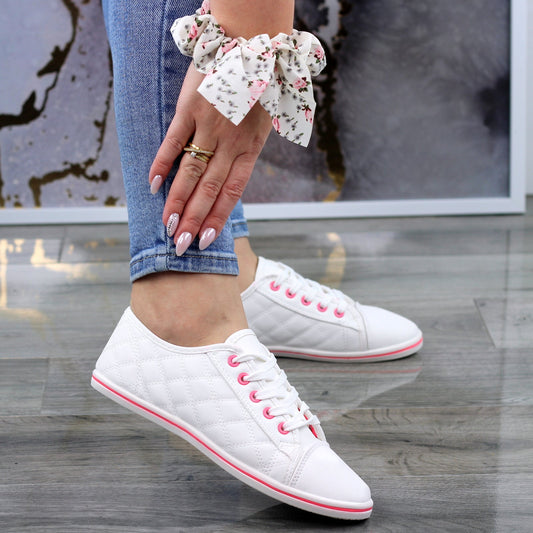 Biało Różowe Skórzane Tenisówki Trampki Pikowane Damskie