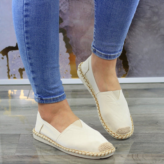 Modne skórzane beżowe espadryle damskie na modnej podeszwie