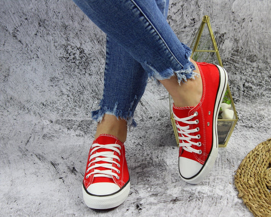 W promocjiCzerwone sznurowane gładkie trampki damskie