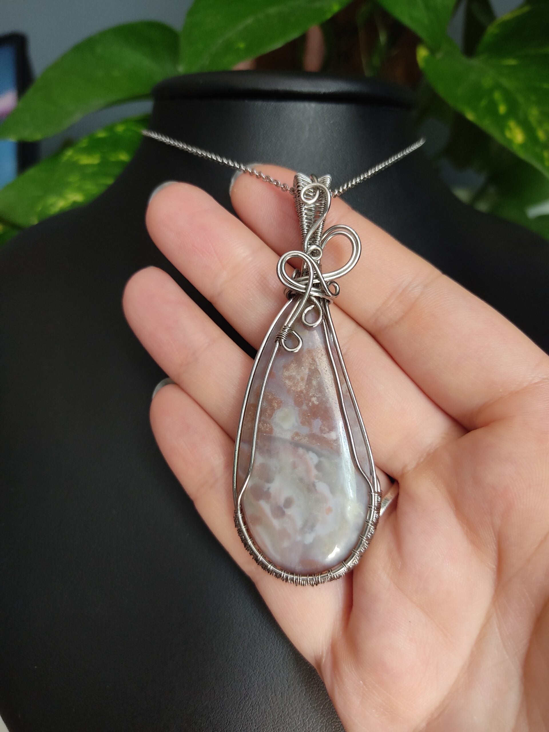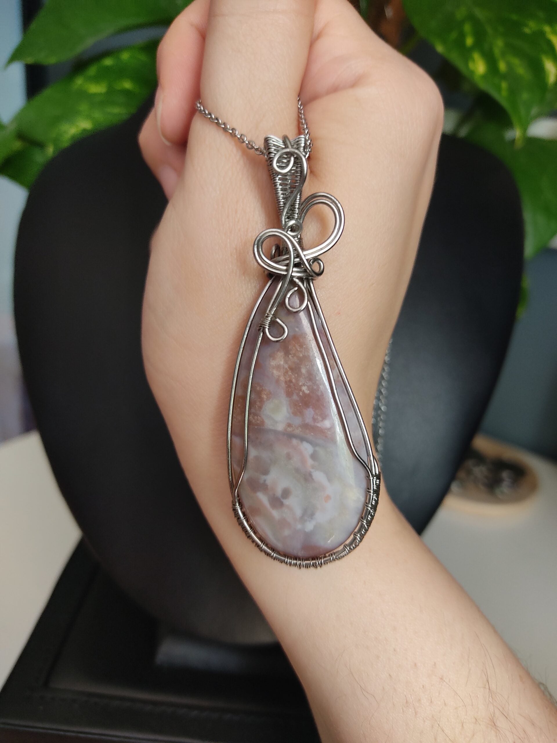 Ręcznie robiony wisiorek z agatem. Wykonany techniką wire wrapping z drutów ze stali chirurgicznej.