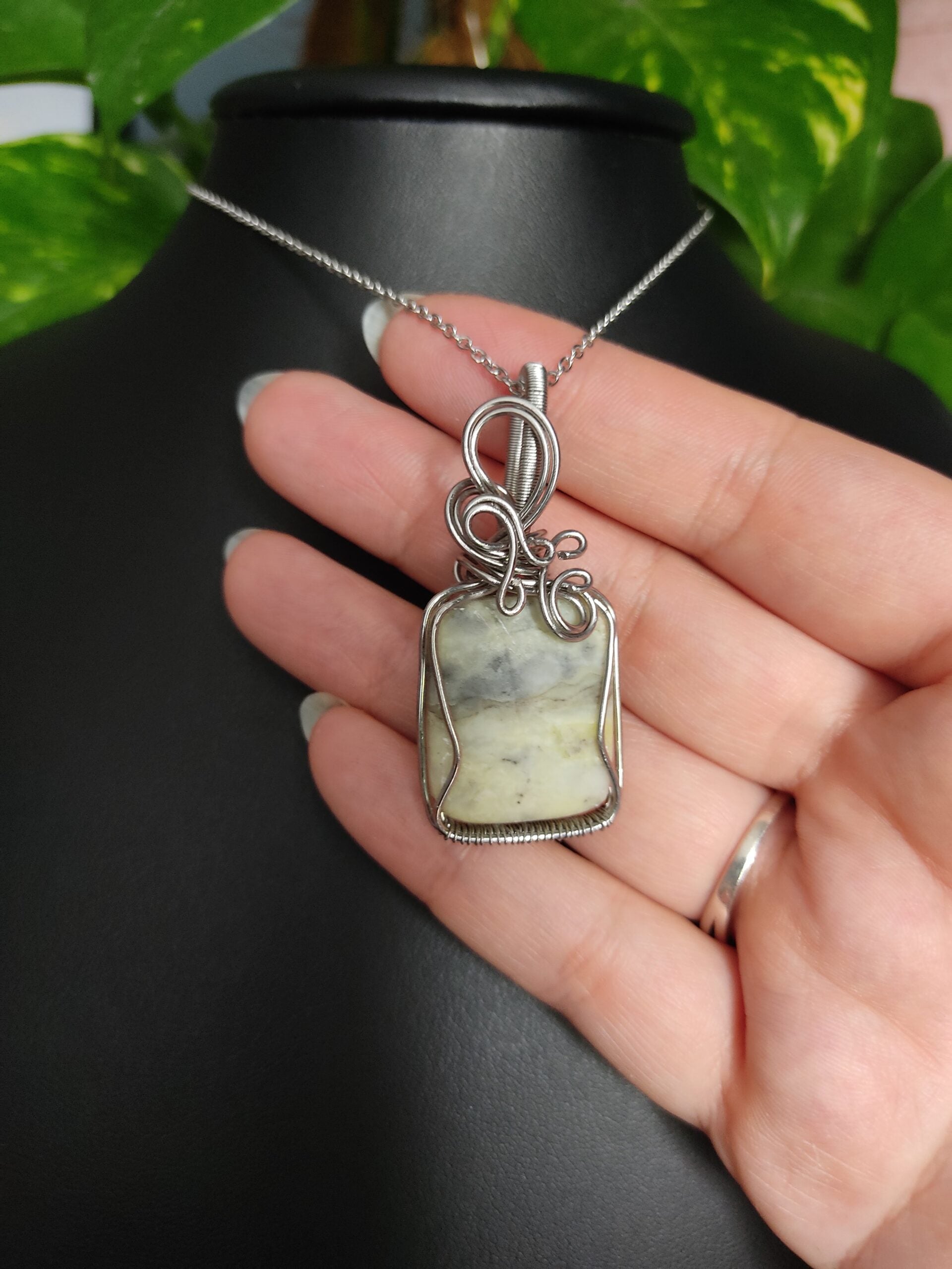 Ręcznie robiony wisiorek z agatem. Wykonany techniką wire wrapping z drutów ze stali chirurgicznej.
