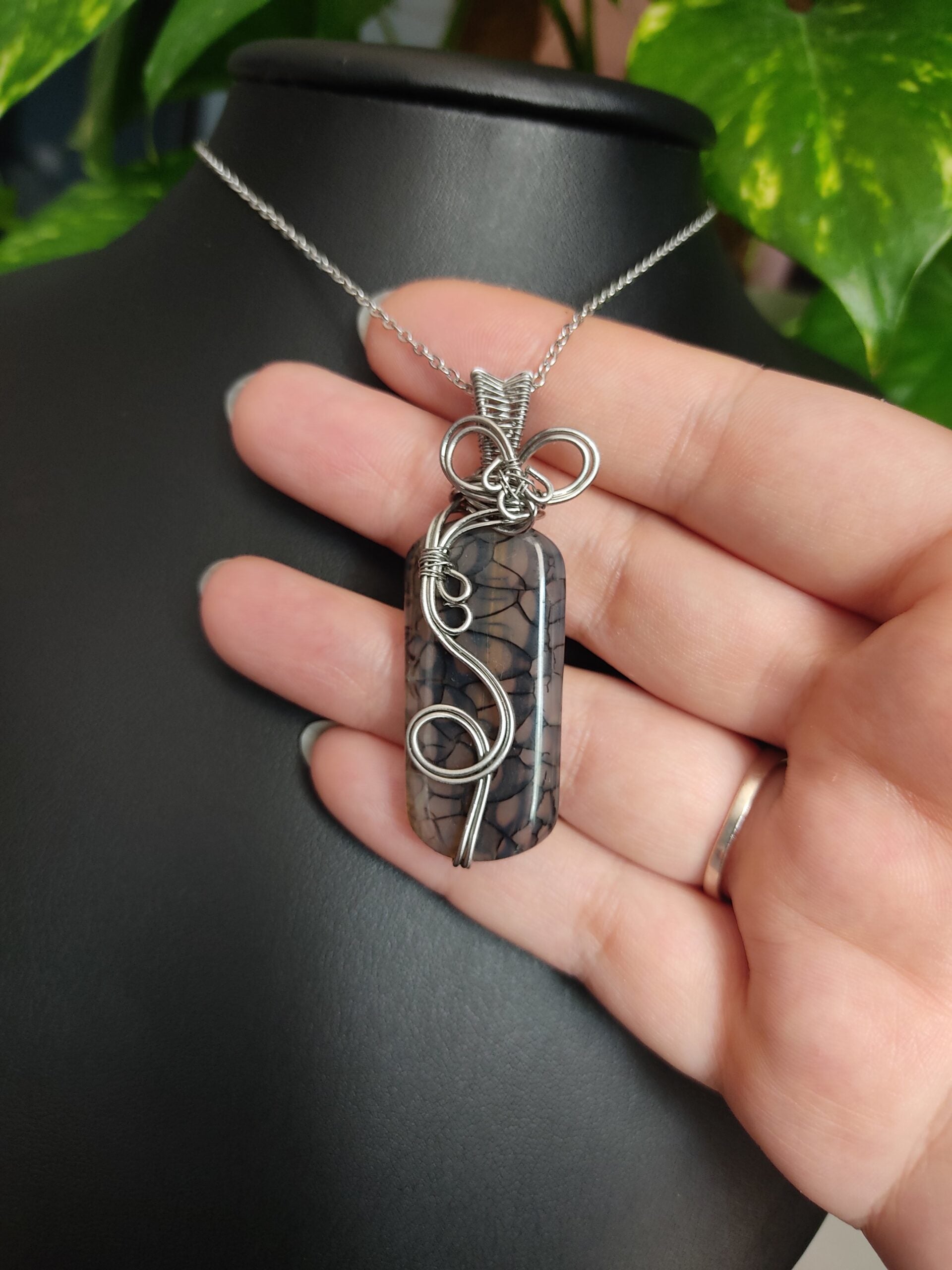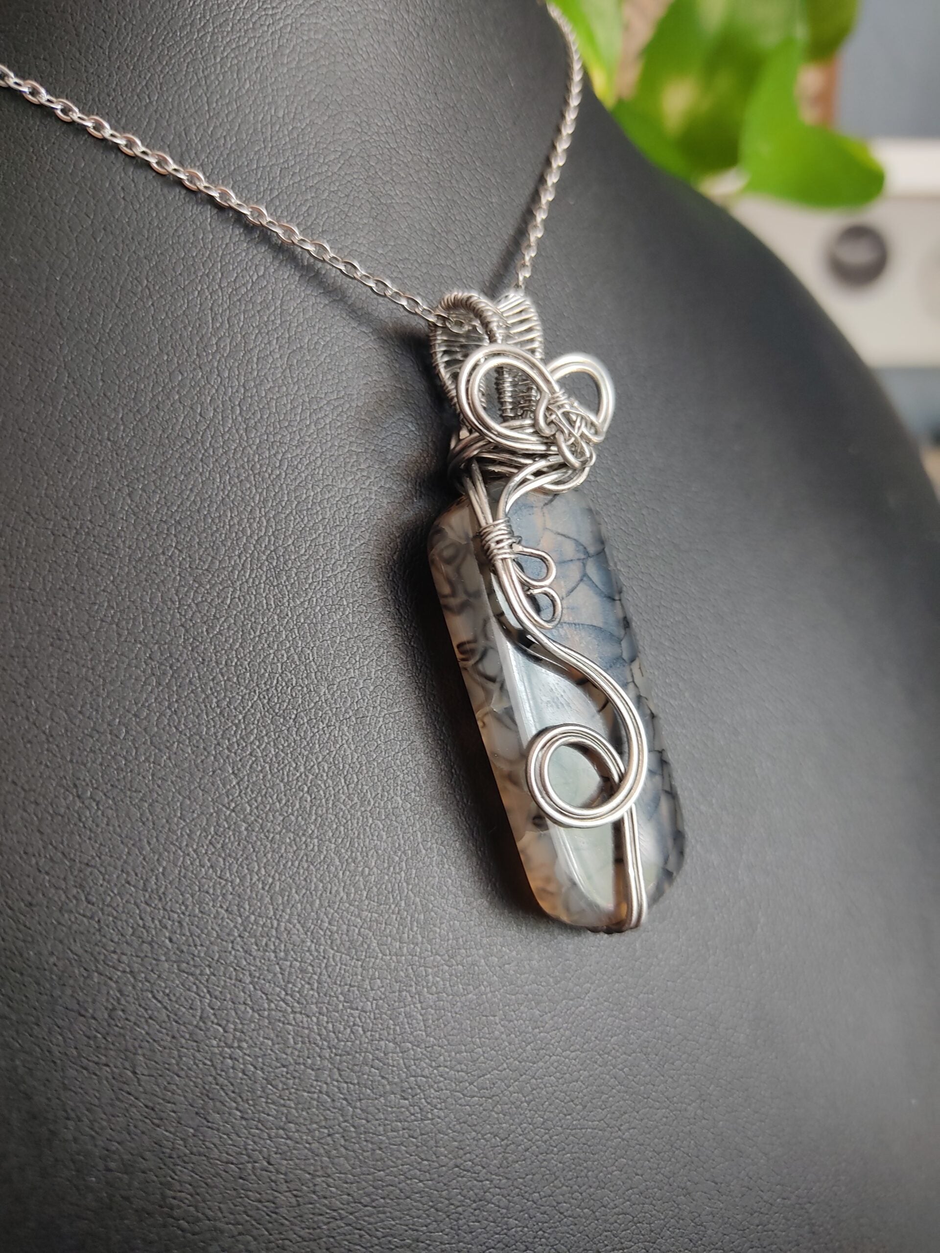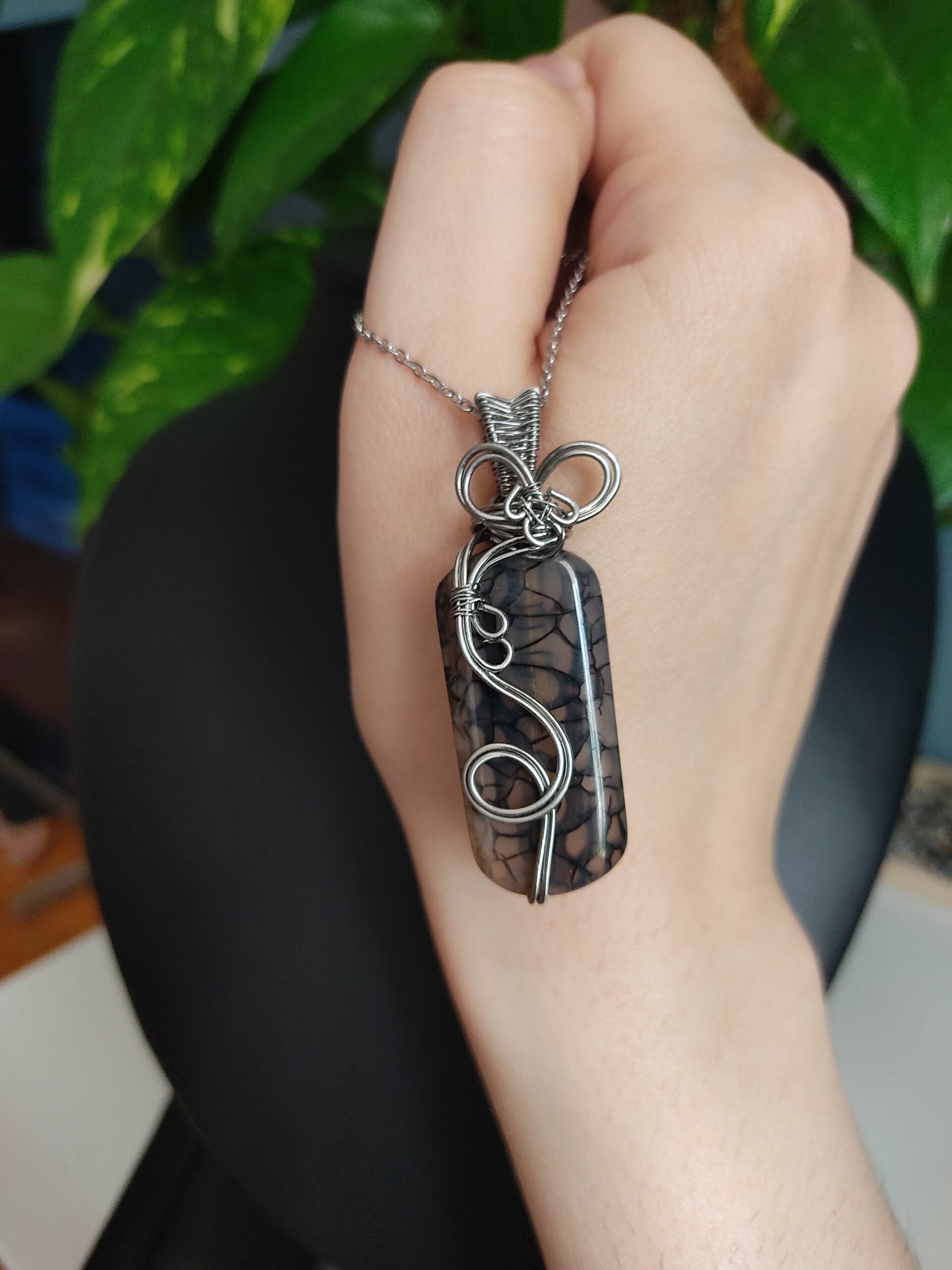 Ręcznie robiony wisiorek z agatem wężowym. Wykonany techniką wire wrapping z drutów ze stali chirurgicznej.