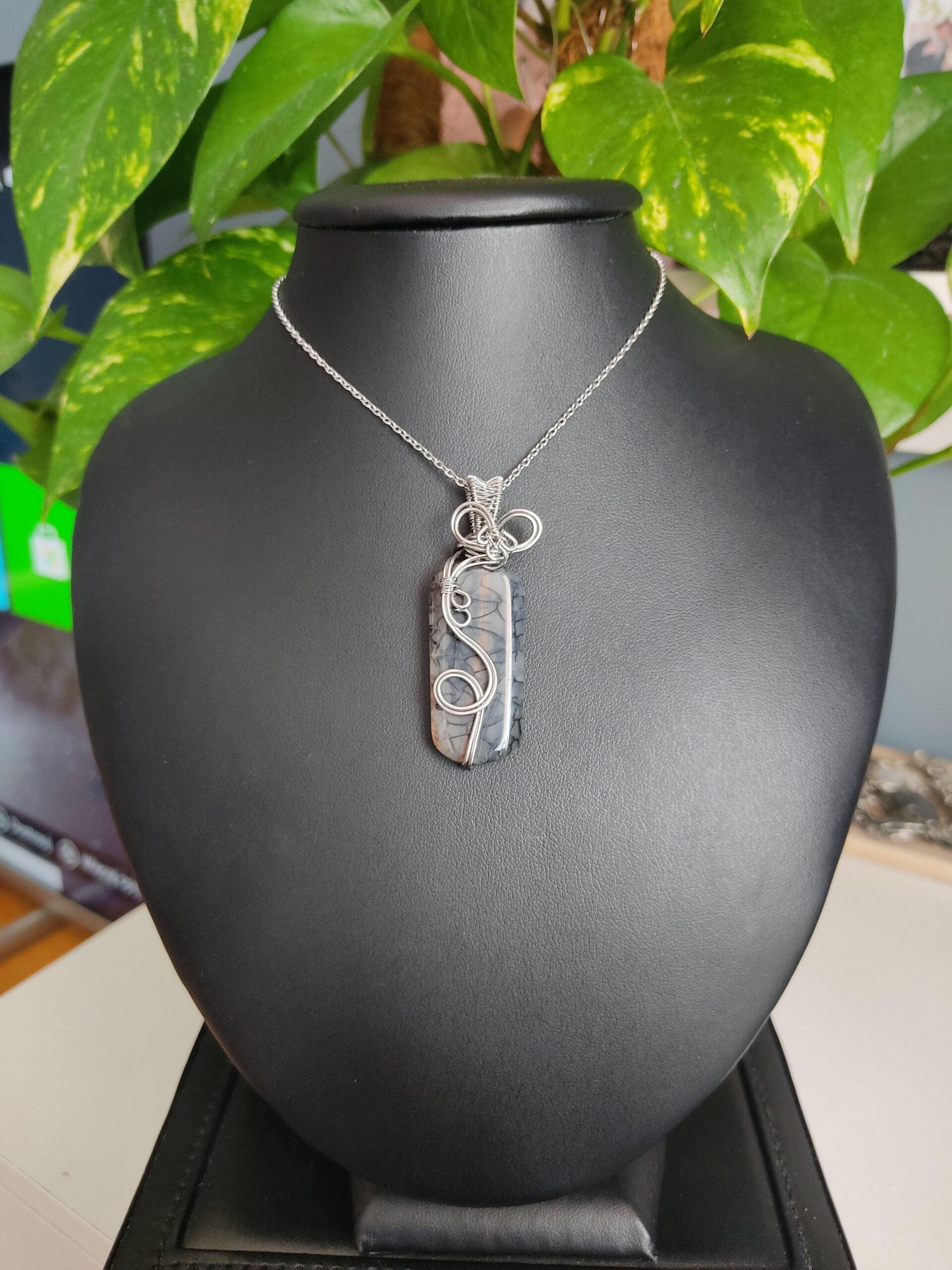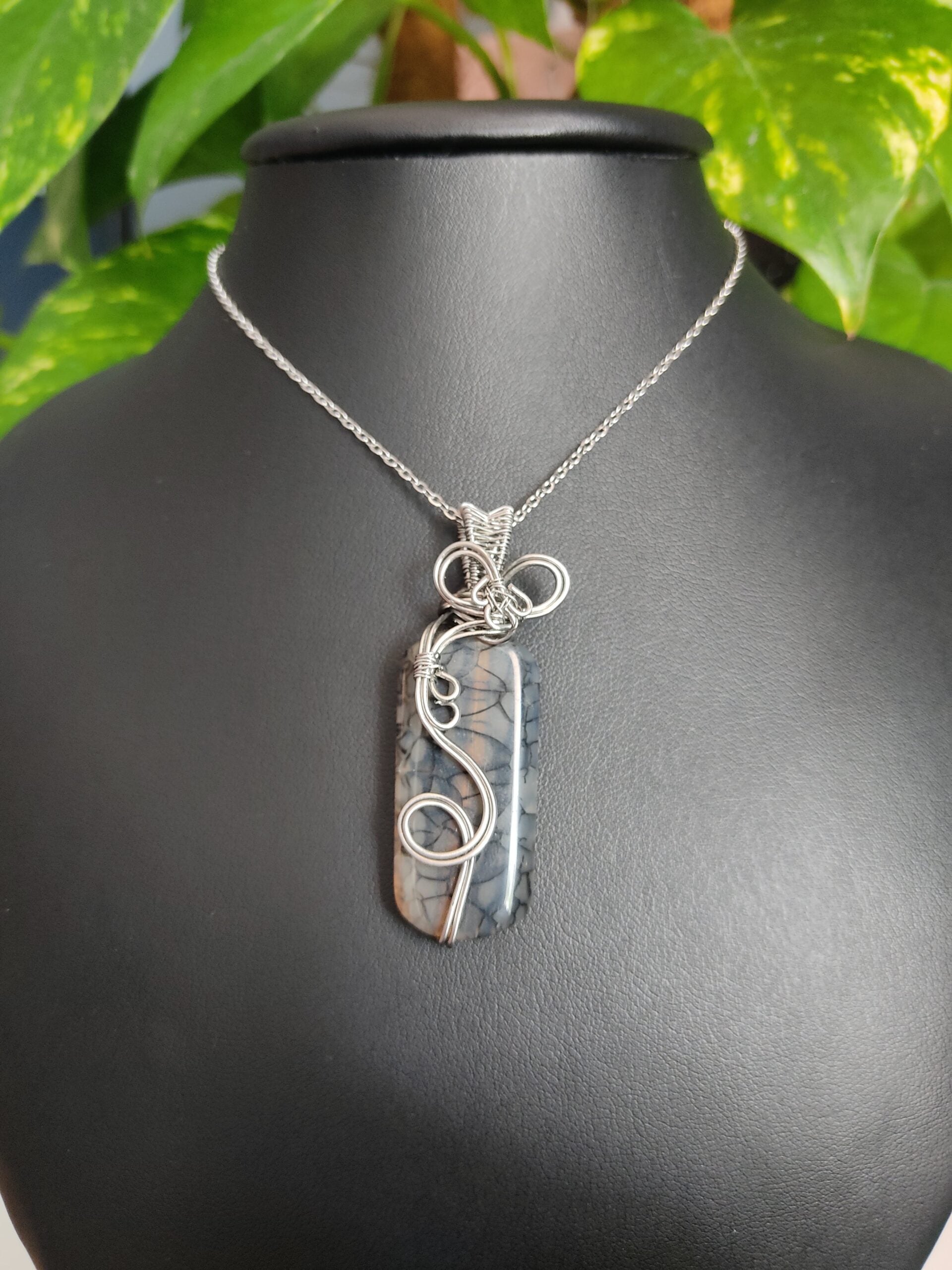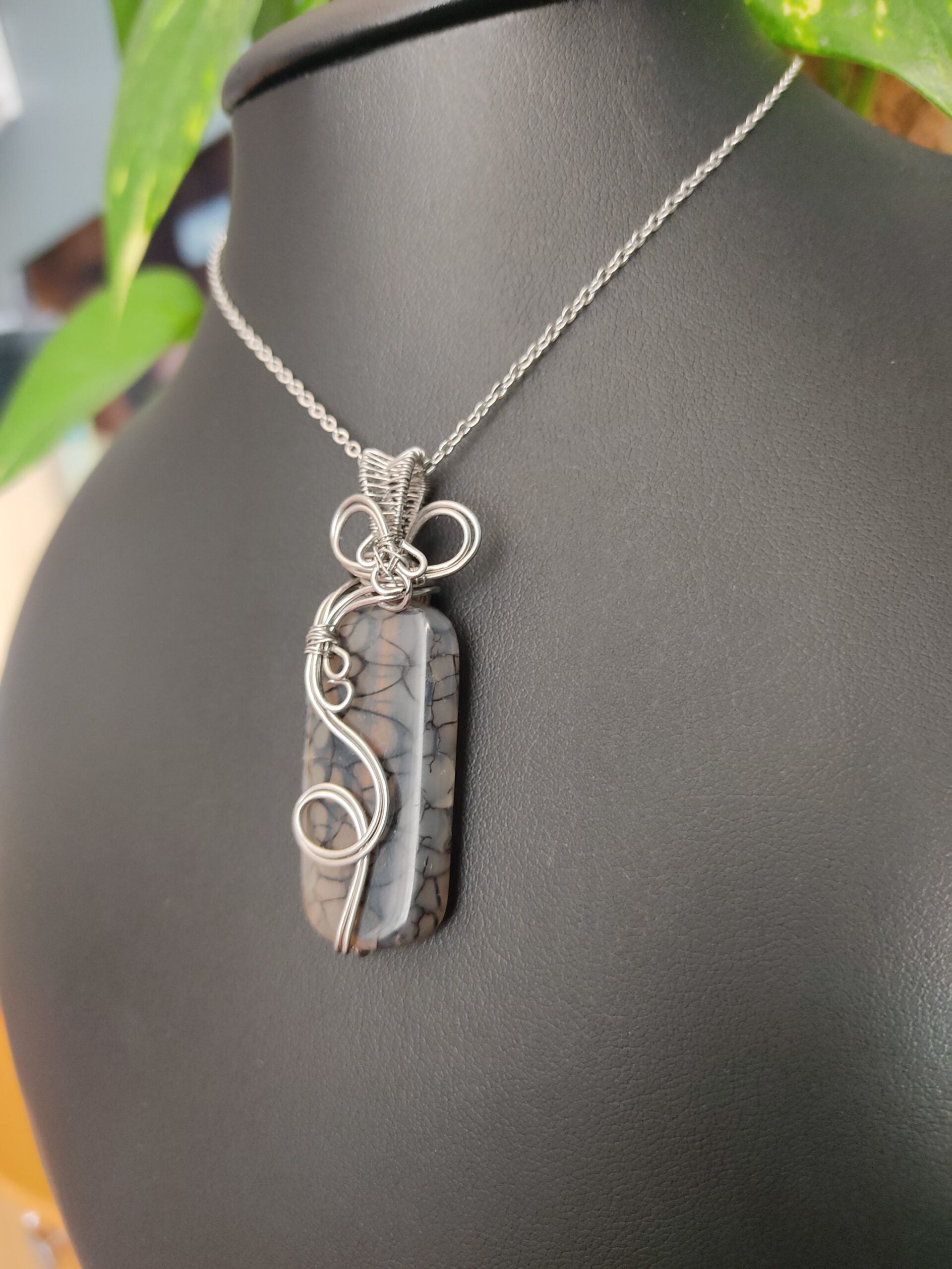 Ręcznie robiony wisiorek z agatem wężowym. Wykonany techniką wire wrapping z drutów ze stali chirurgicznej.