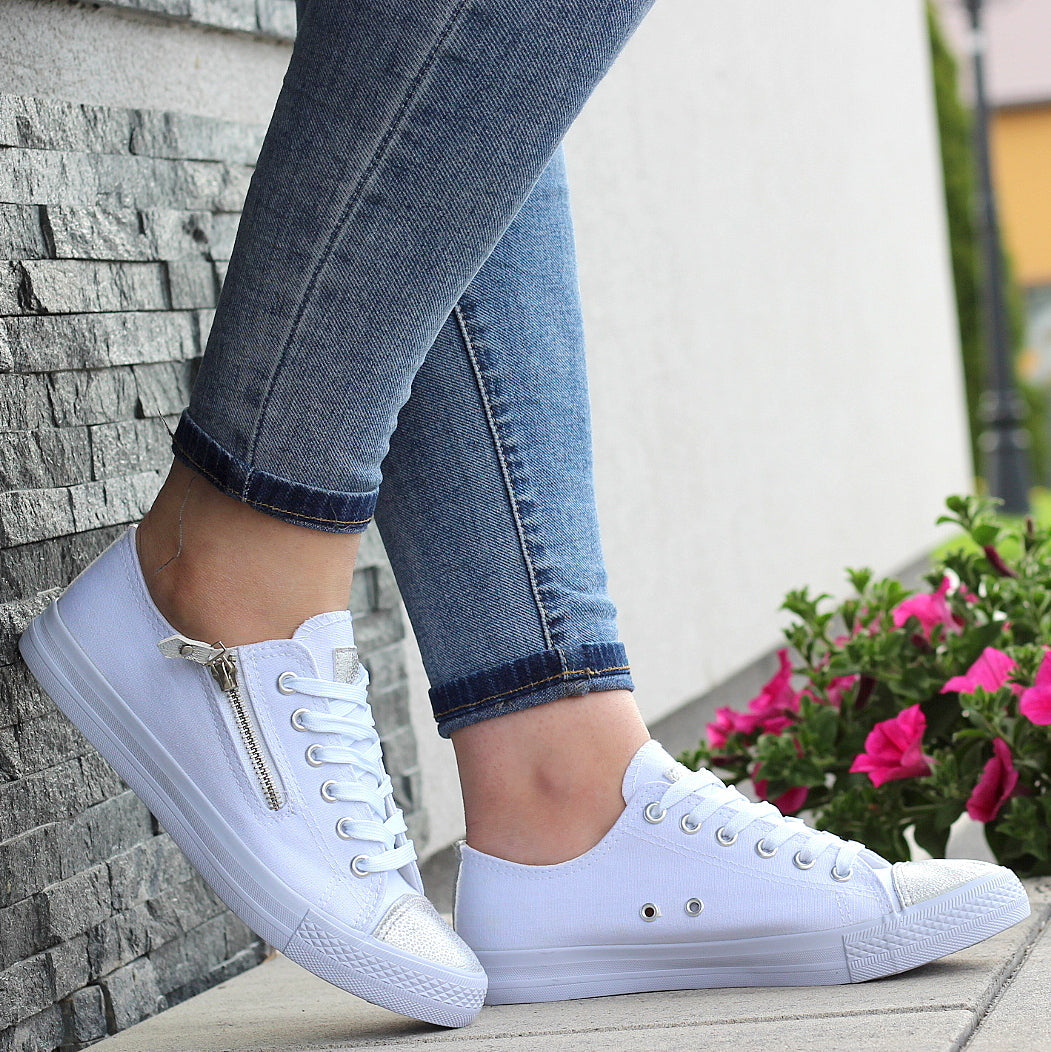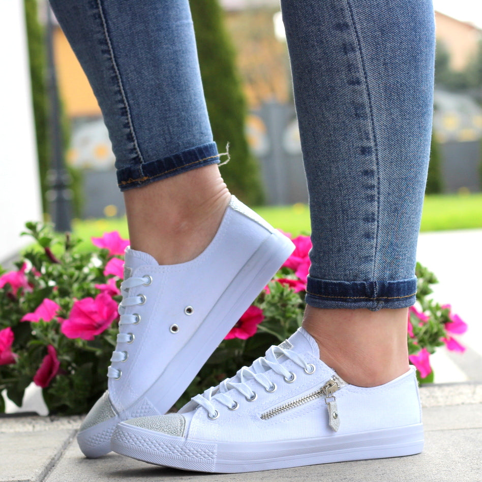 Białe miękkie tenisówki materiałowe slim suwaczek