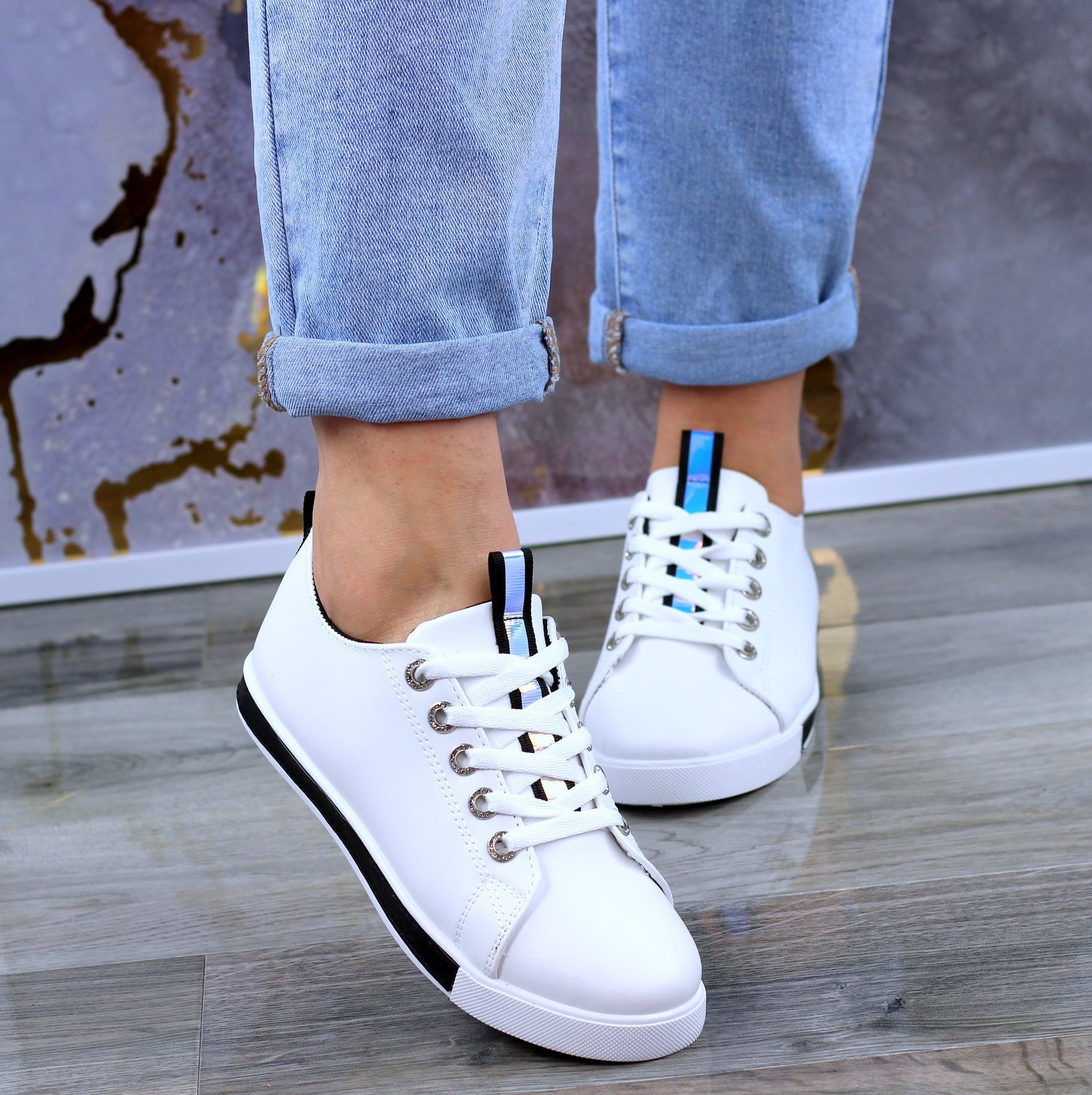 MODNE BIAŁO CZARNE SKÓRZANE TRAMPKI DAMSKIE SZNUROWANE