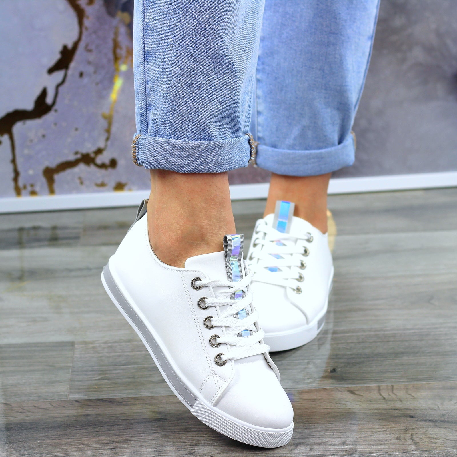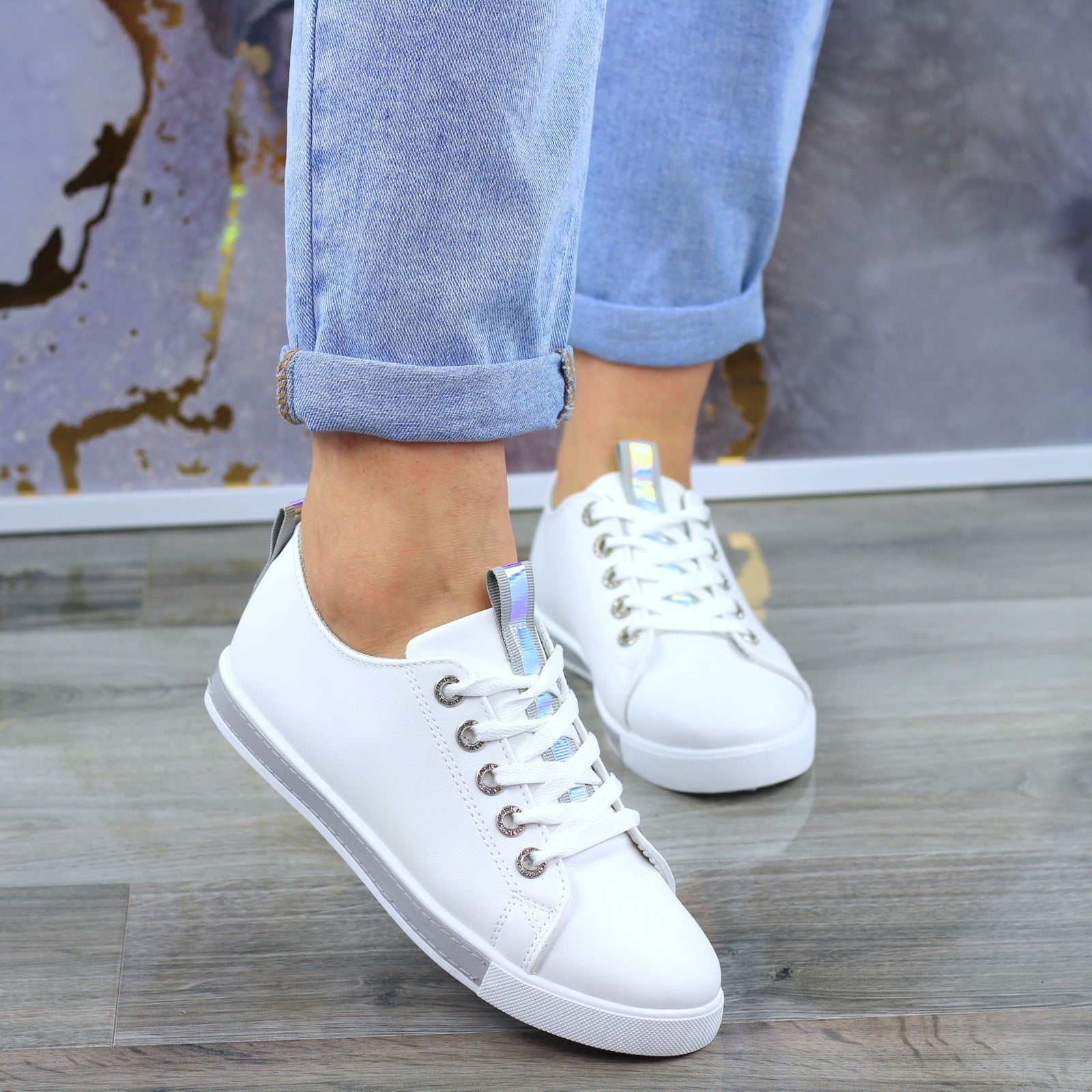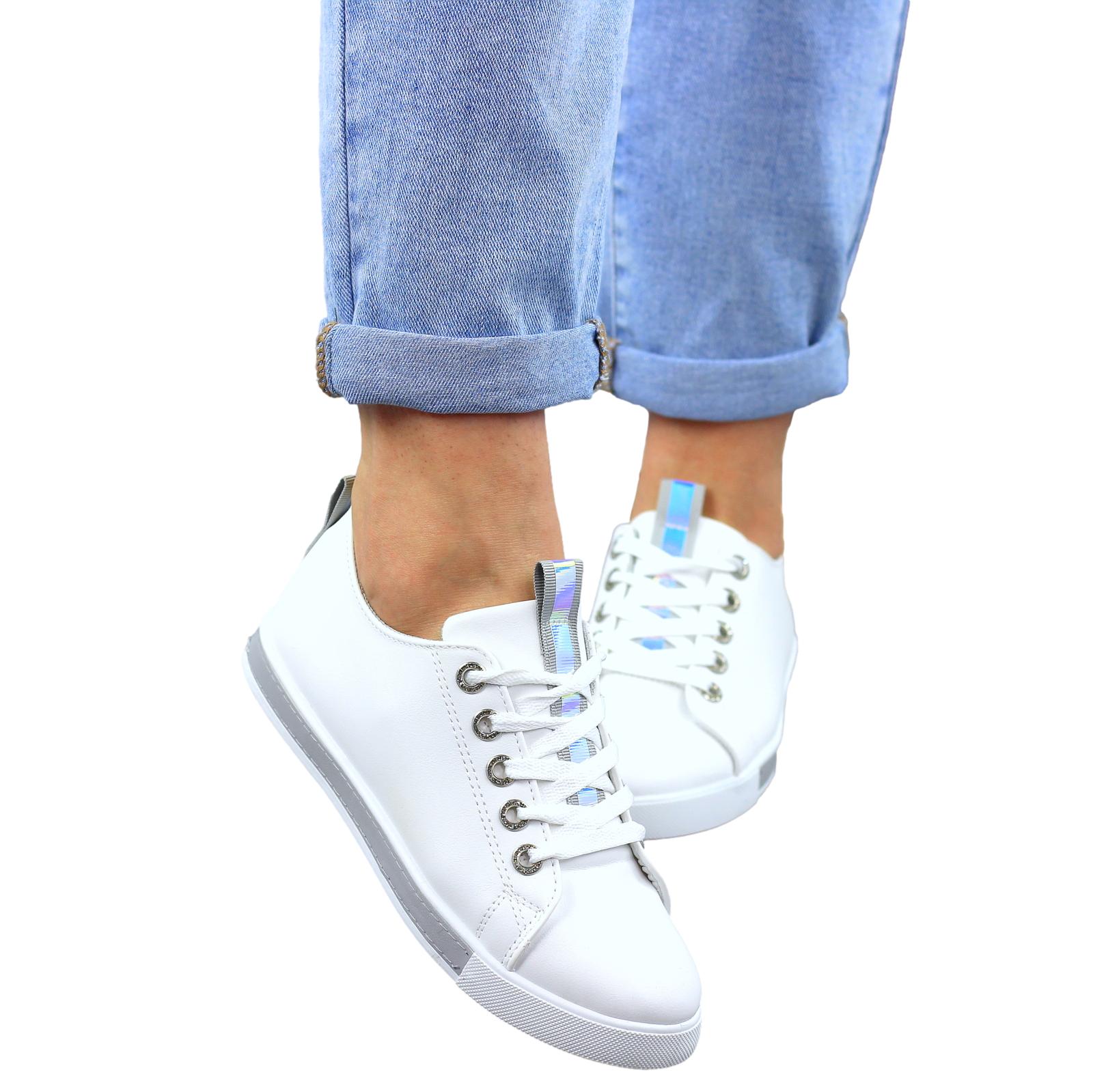 BIAŁO SZARE SKÓRZANE GŁADKIE TRAMPKI DAMSKIE efekt holo