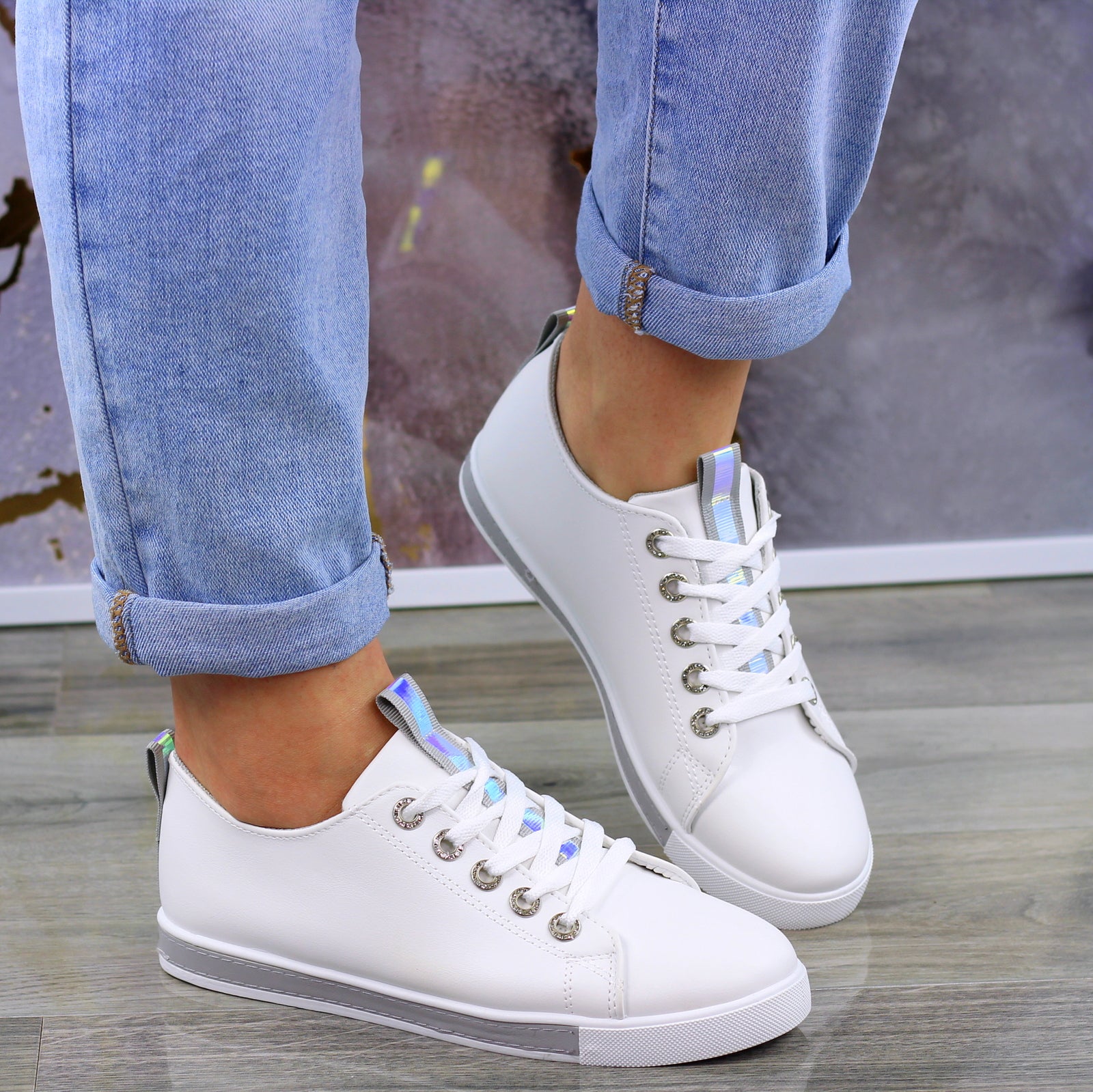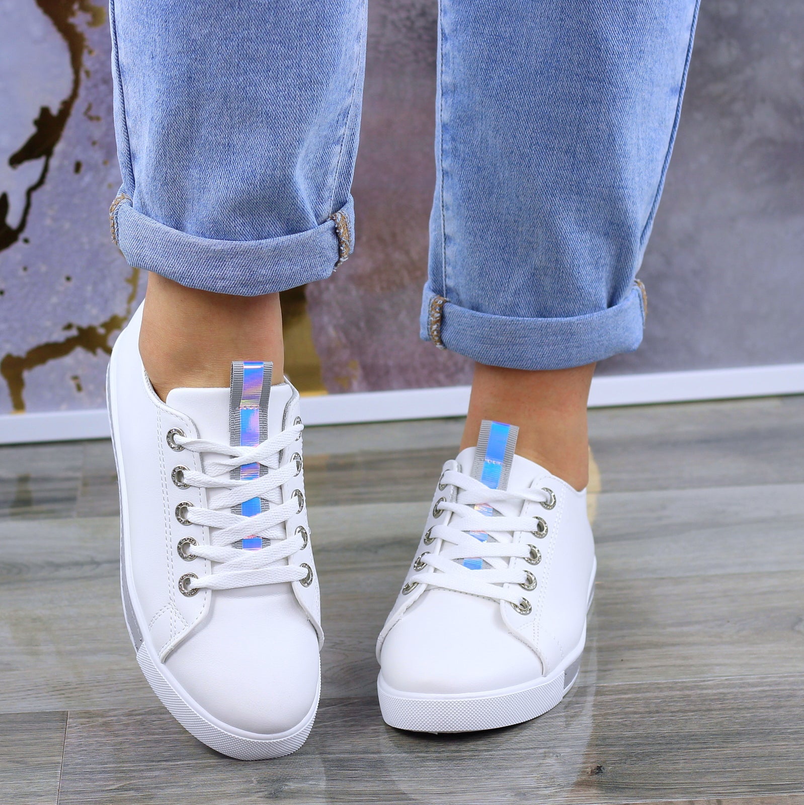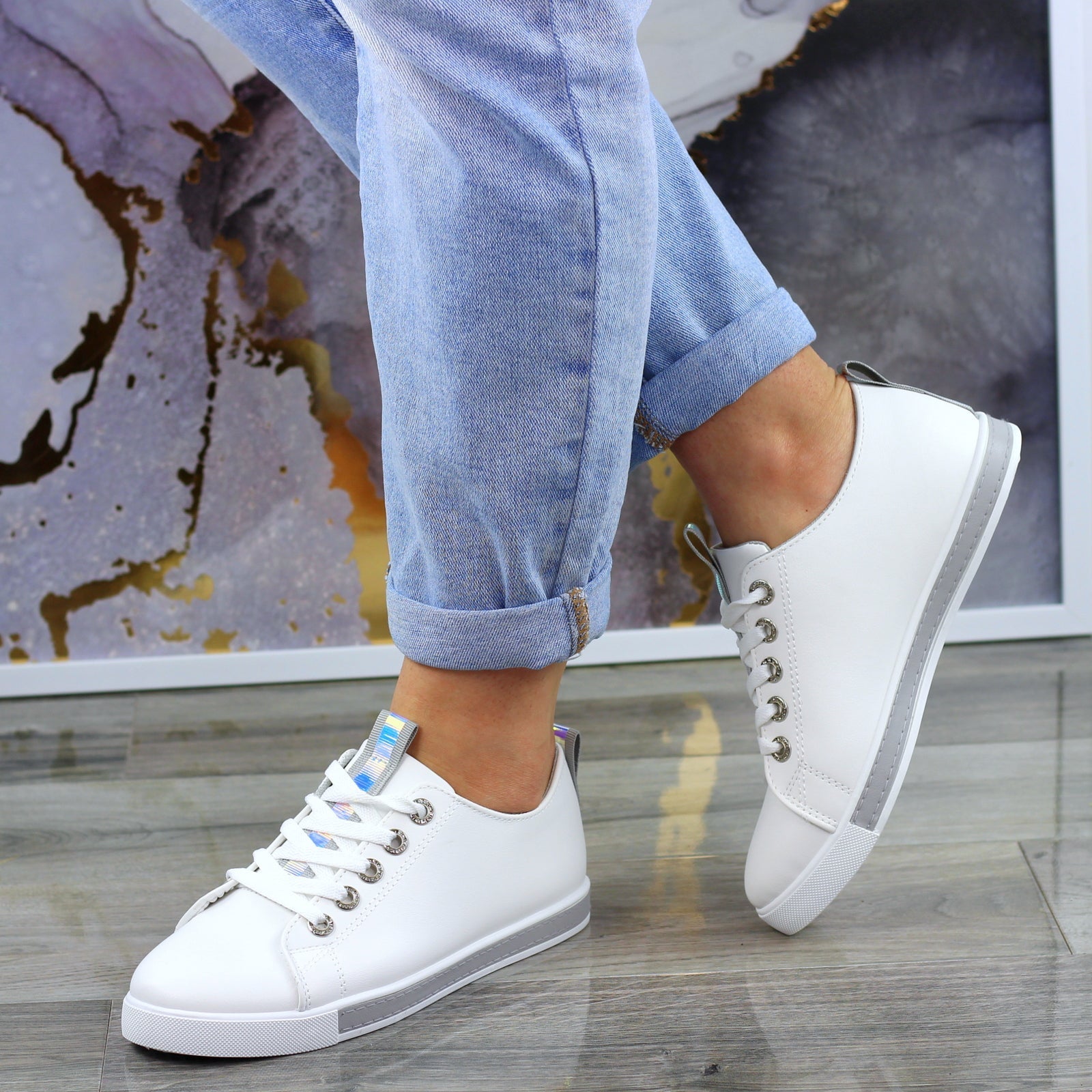 BIAŁO SZARE SKÓRZANE GŁADKIE TRAMPKI DAMSKIE efekt holo
