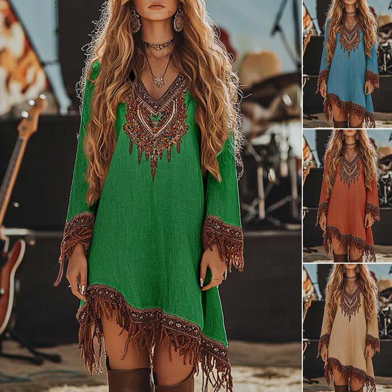 1 sztuka damskiej sukienki z frędzlami i nadrukiem w stylu retro