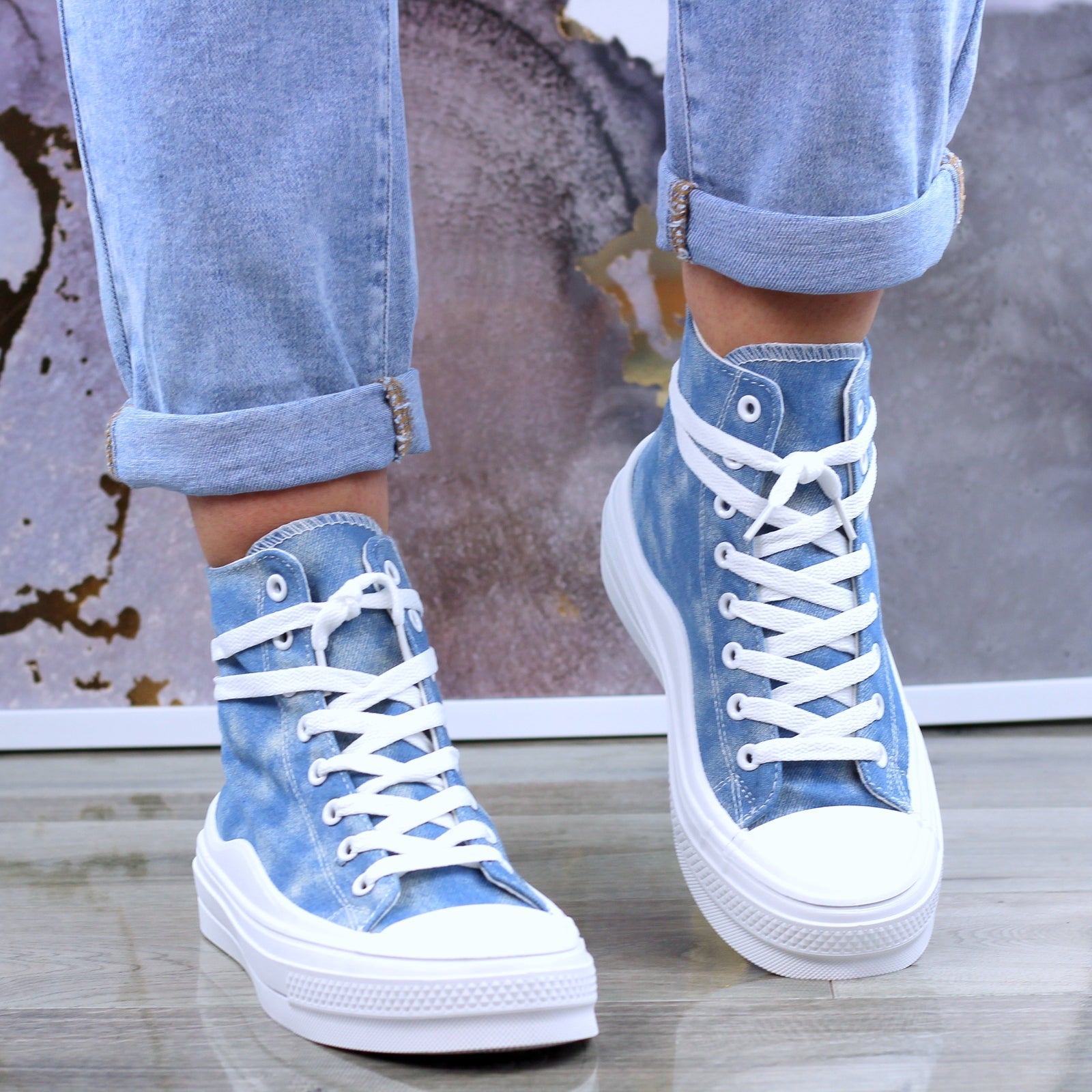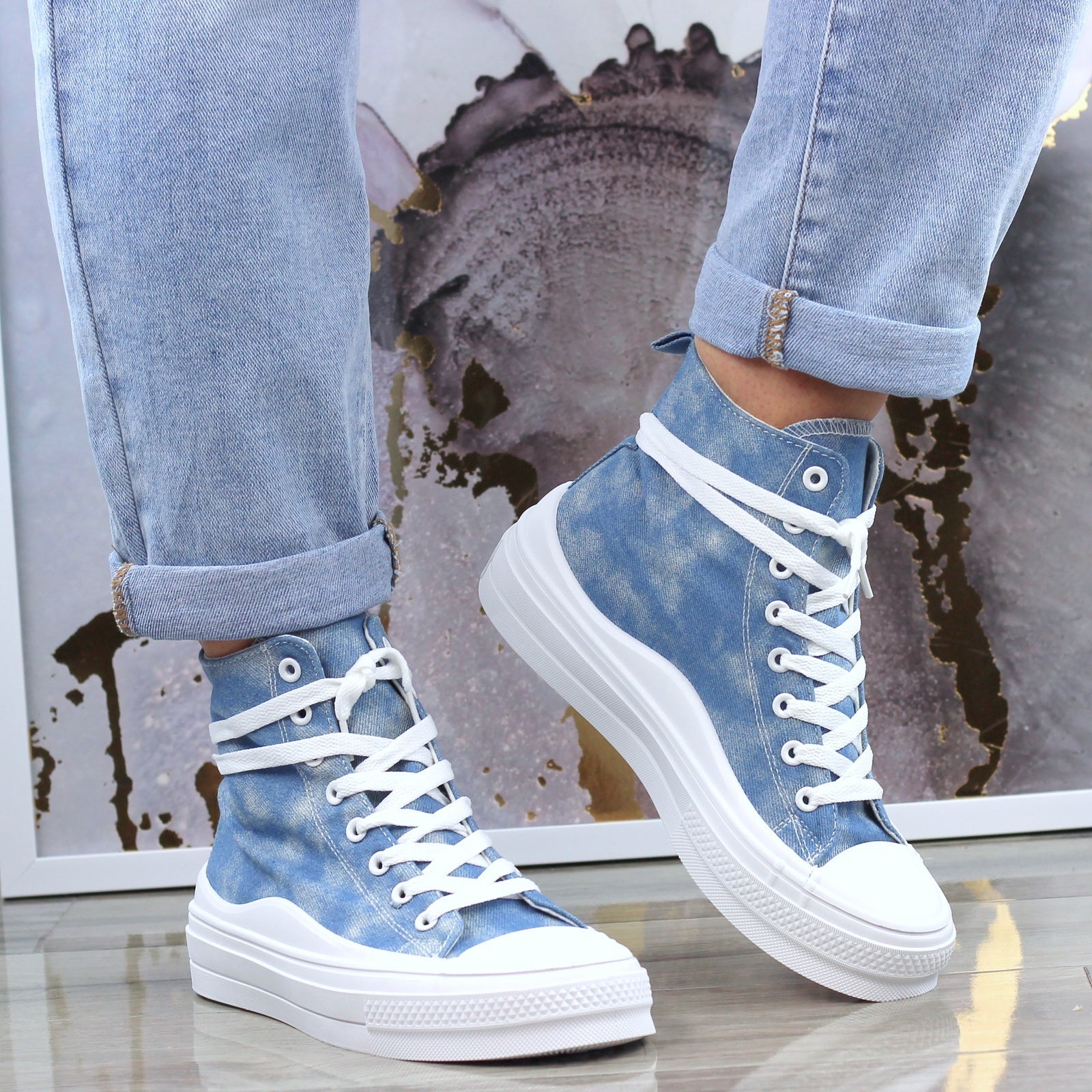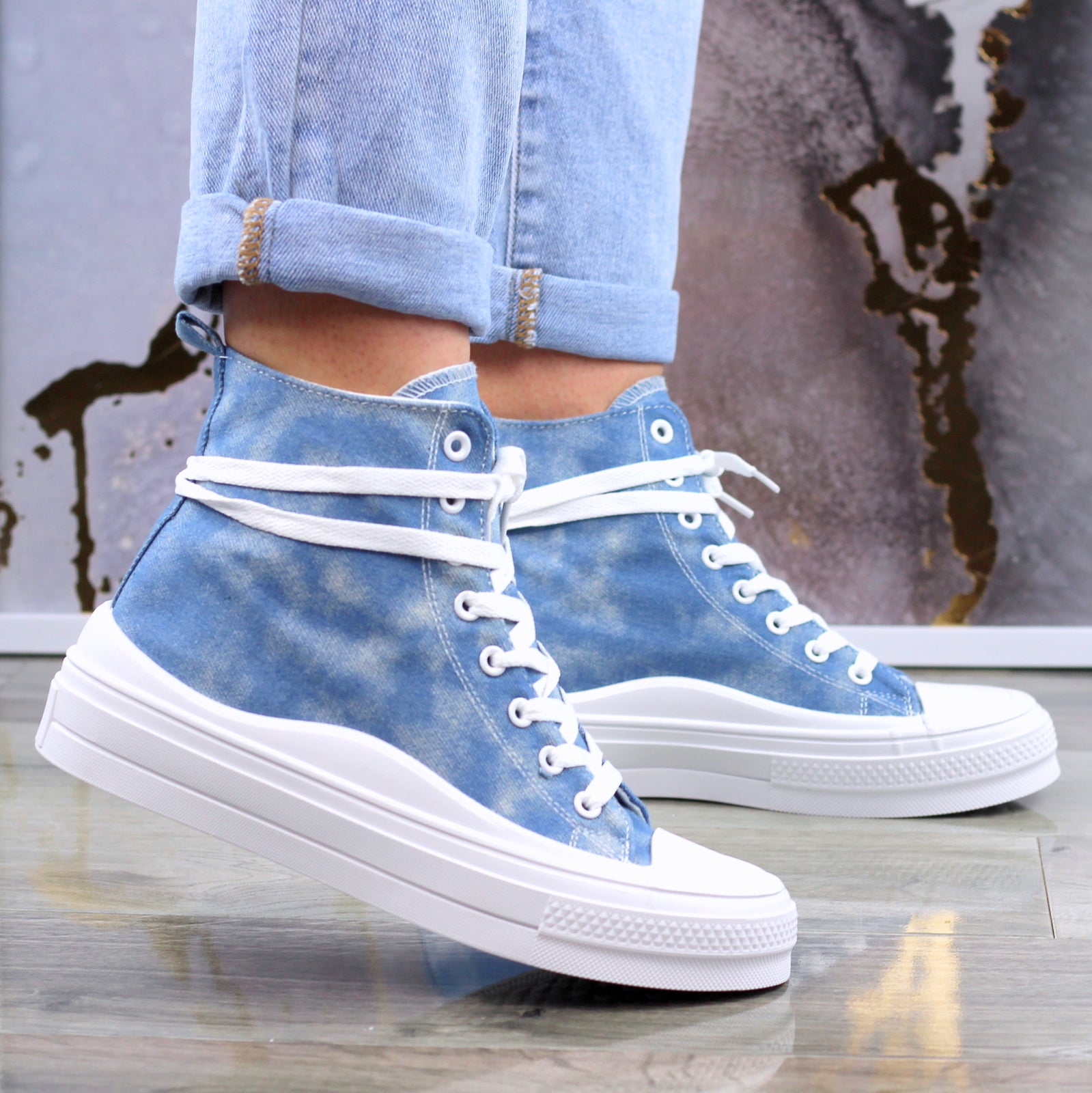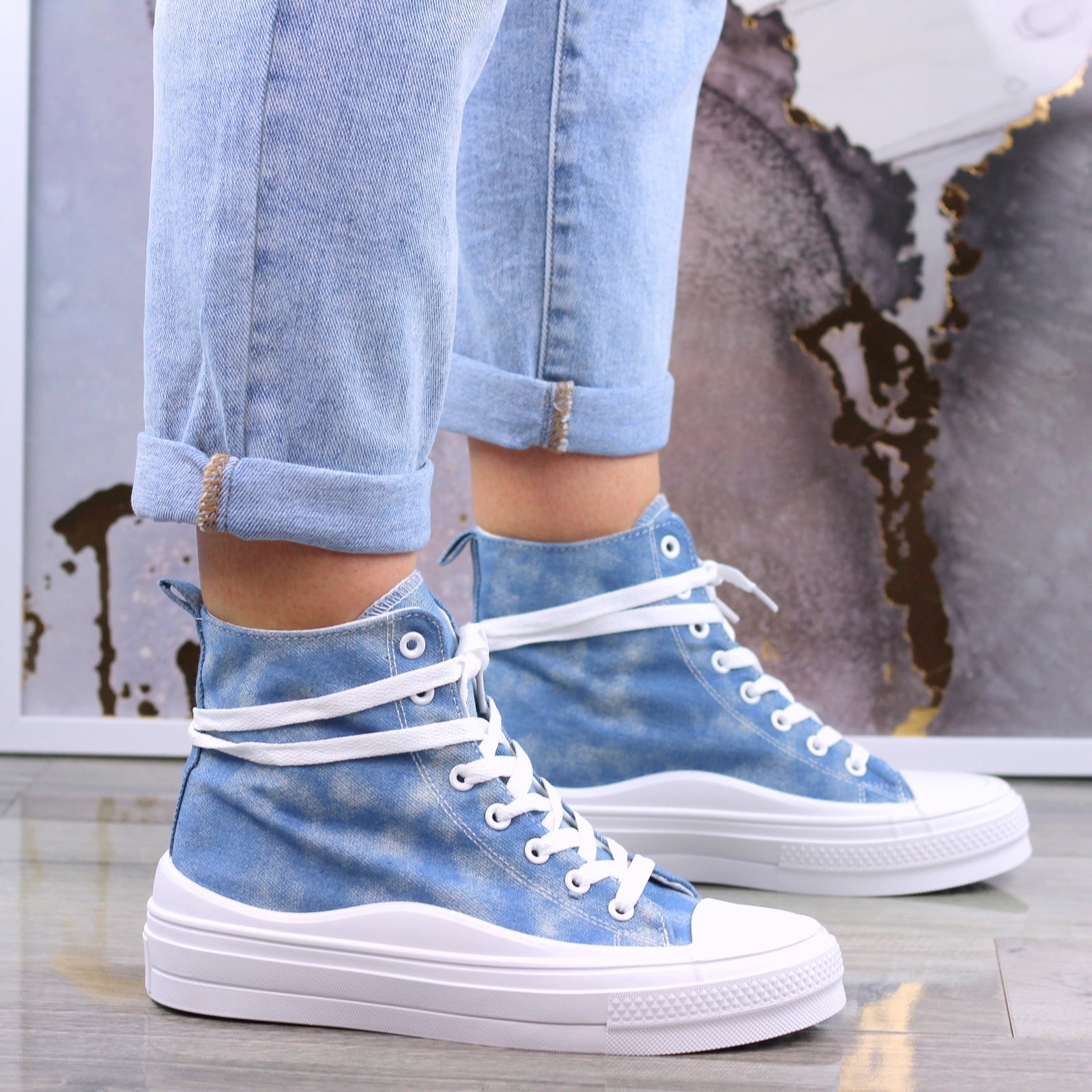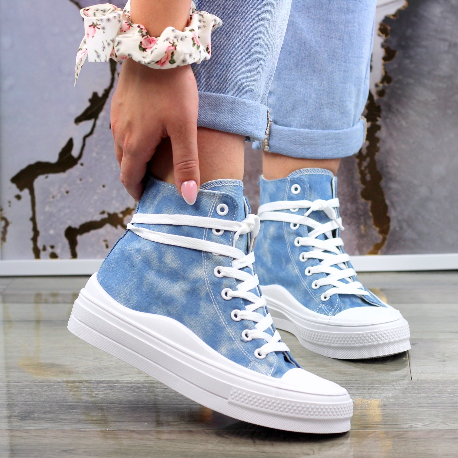 JASNO DŻINSOWE DŁUGIE TRAMPKI DAMSKIE NA GRUBEJ PODESZWIE