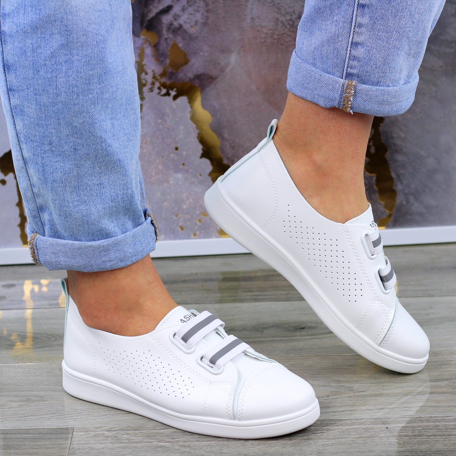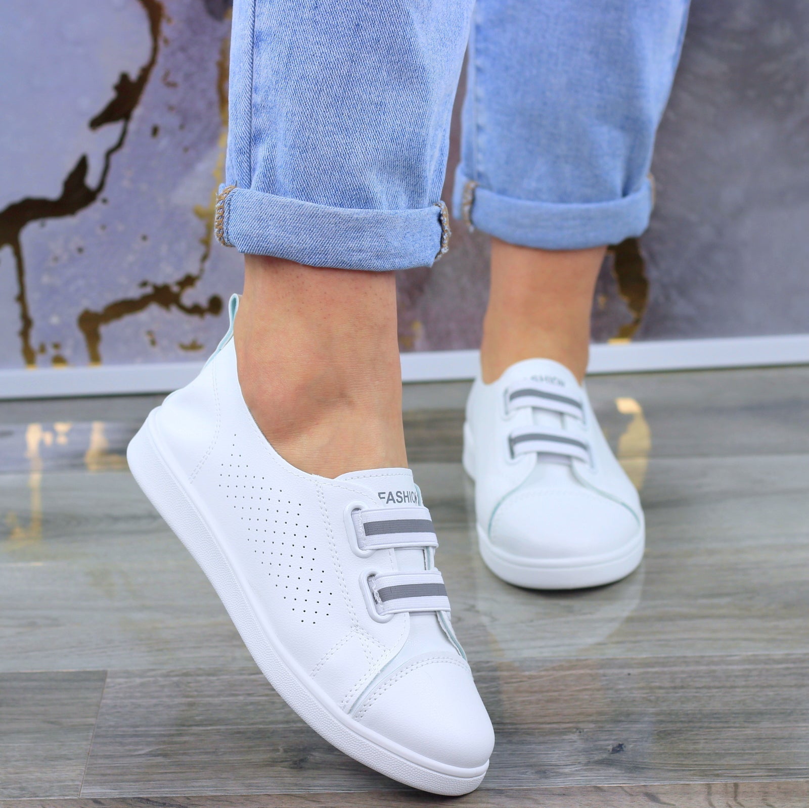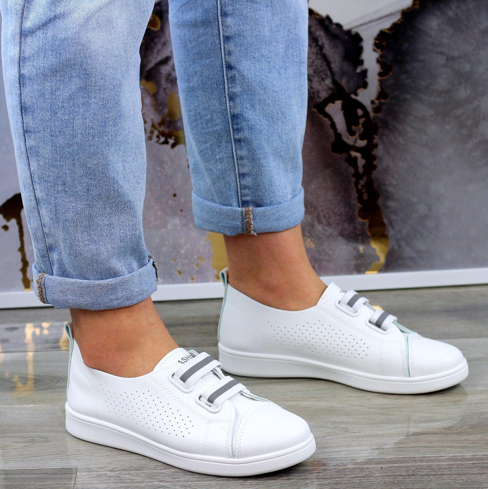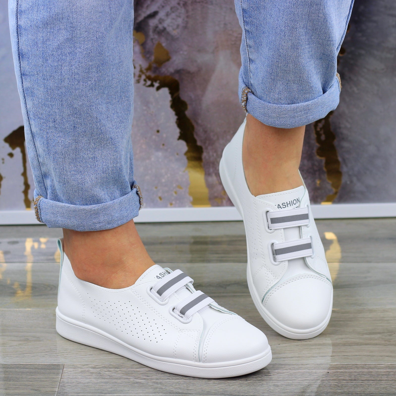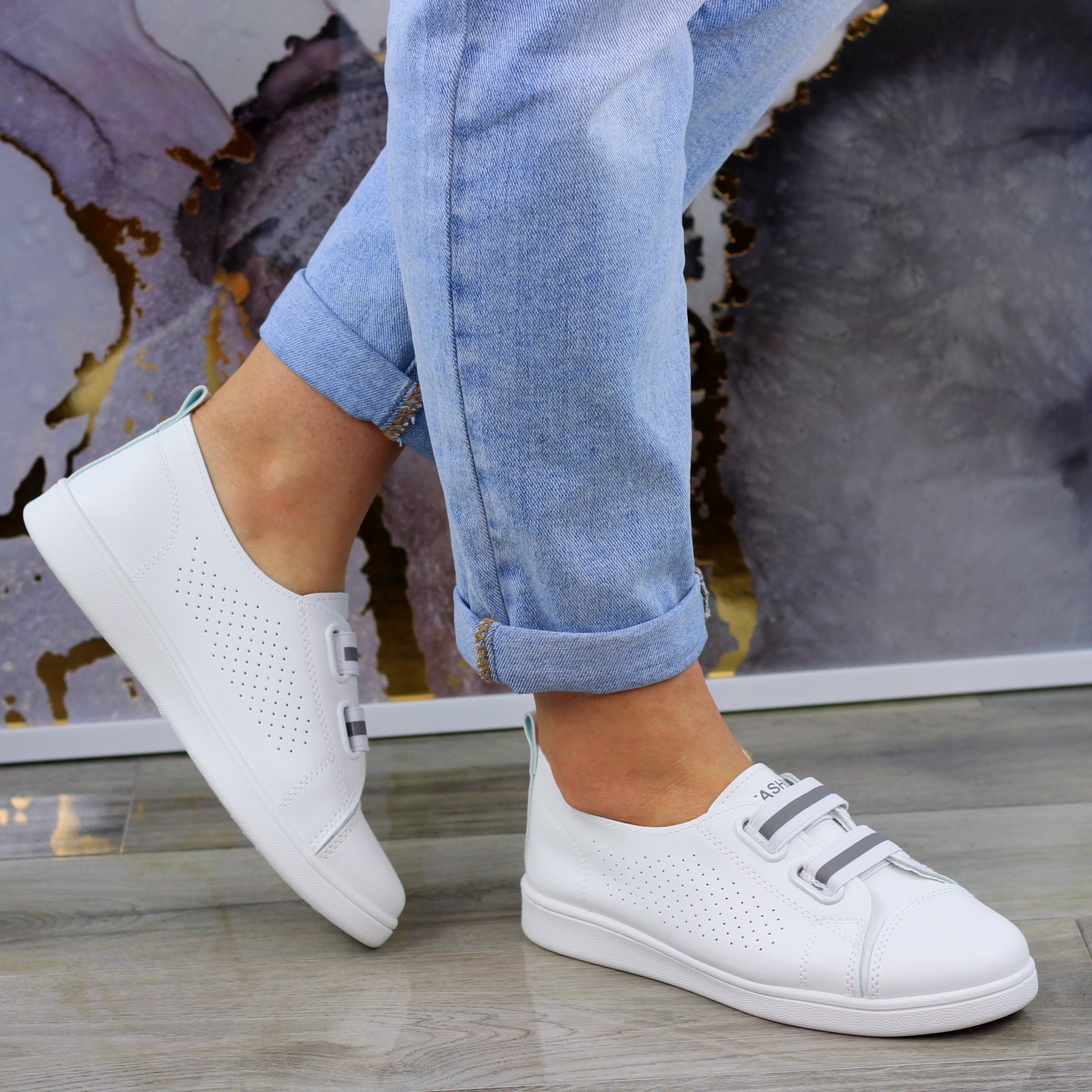 MODNE BIAŁE AŻUROWE SKÓRZANE TENISÓWKI TRAMPKI DAMSKIE WSUWANE FASHIONS