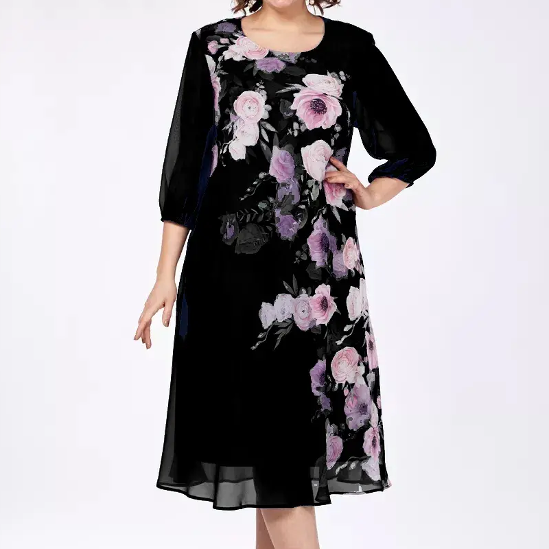 Pakiet zawiera 1 * Elegancką damską sukienkę z okrągłym dekoltem i kwiatowym nadrukiem